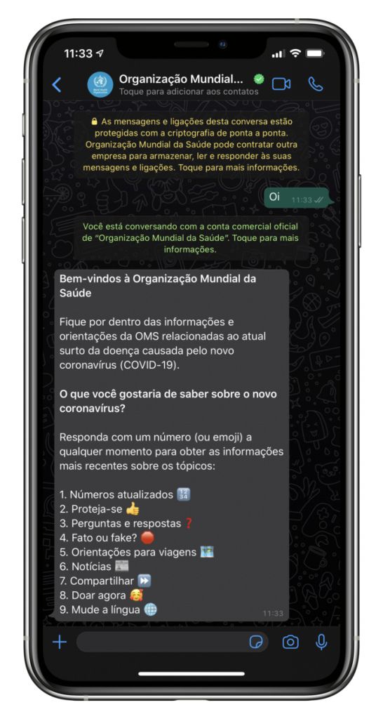 Para consultá-lo, basta enviar um “Oi” para o número +41 22 501-7735 (clique no link para já fazer isso diretamente). Depois, é só seguir o menu de opções para obter informações precisas sobre a pandemia.