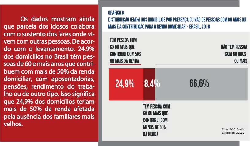 As pessoas com mais de 60 anos são parte do grupo mais vulnerável à pandemia do novo coronavírus. Entretanto, a cada quatro lares do Brasil, em um deles o idoso é o principal responsável pela renda, segundo pesquisa do Dieese pesquisa do Dieese. De acordo com o levantamento, 24,9% dos domicílios no Brasil têm pessoas de 60 anos ou mais, que contribuem com mais de 50% da renda domiciliar, com aposentadorias, pensões, rendimento do trabalho ou de outro tipo.