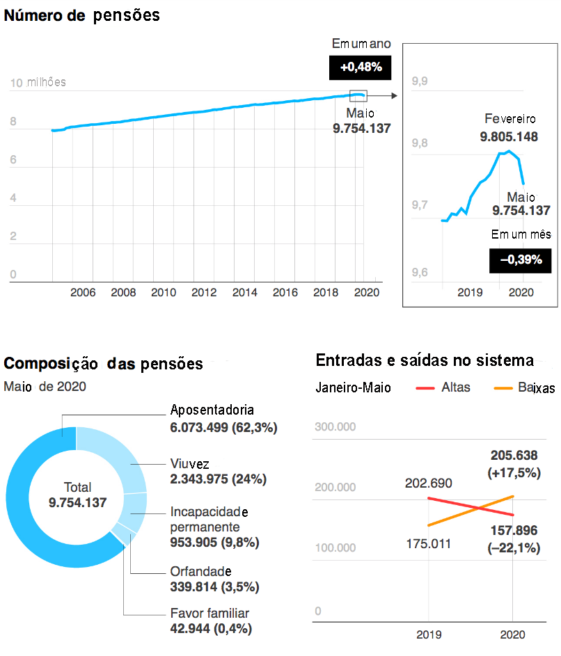 Tudo isso é visto nos dados divulgados pela Previdência Social. Entre janeiro e maio, houve 157.896 novas aposentadorias, 22,1% a menos do que no mesmo período de 2019. Por outro lado, as perdas, em grande parte devido à morte do aposentado, aumentaram para 205.638, 17,5% a mais que no ano anterior. Durante esses cinco meses, praticamente metade do tempo em que o estado de emergênica está em vigor.