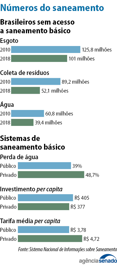 Segundo levantamento de 2018 realizado pelo Sistema Nacional de Informações sobre Saneamento (SNIS), 35 milhões de brasileiros (16,38%) não têm acesso à água tratada e cerca de 100 milhões (47%) não têm rede de coleta de esgoto. “Essa modernização é absolutamente necessária e urgente. Conforme já apontaram pareceres sobre as matérias mencionadas, o modelo institucional do setor precisa ser otimizado de modo a superar os graves índices hoje observados no Brasil”, explicou o relator da matéria, Tasso Jereissati (PSDB-CE), em seu parecer.