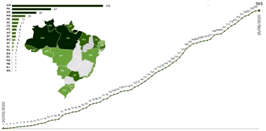 Independente da base de dados, os números avançam em curva ascendente sem sinais de achatamento. Em 1º de junho, a Apib contabilizava 1,8 mil infectados em povos indígenas. Os números da Sesai estavam em 1,3 mil casos confirmados. Ambos os registros tiveram um acréscimo perto de 500% em apenas um mês.