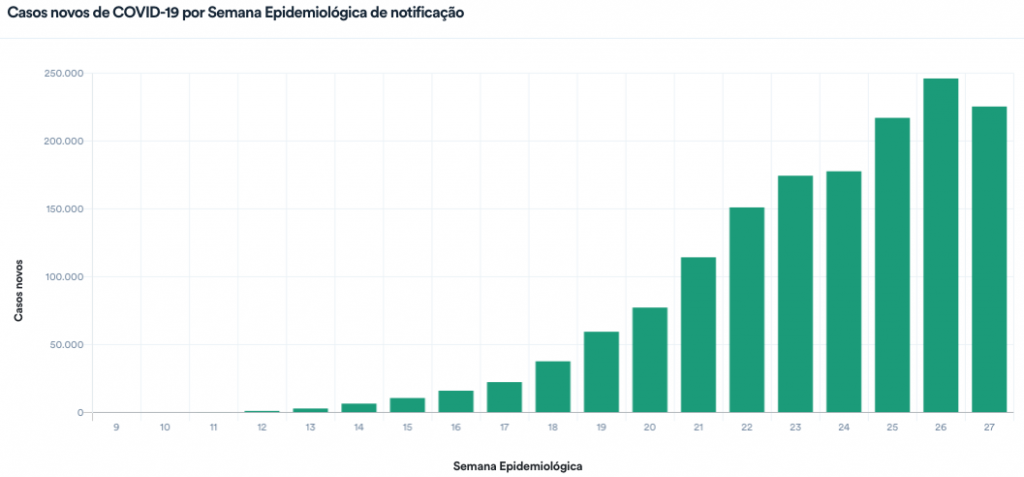 O Ministério da Saúde divulgou hoje que o Brasil tem 1.290 novas mortes contabilizadas em decorrência do coronavírus, elevando o total para 63.174 óbitos desde o início da pandemia — a letalidade é de 4.1%.