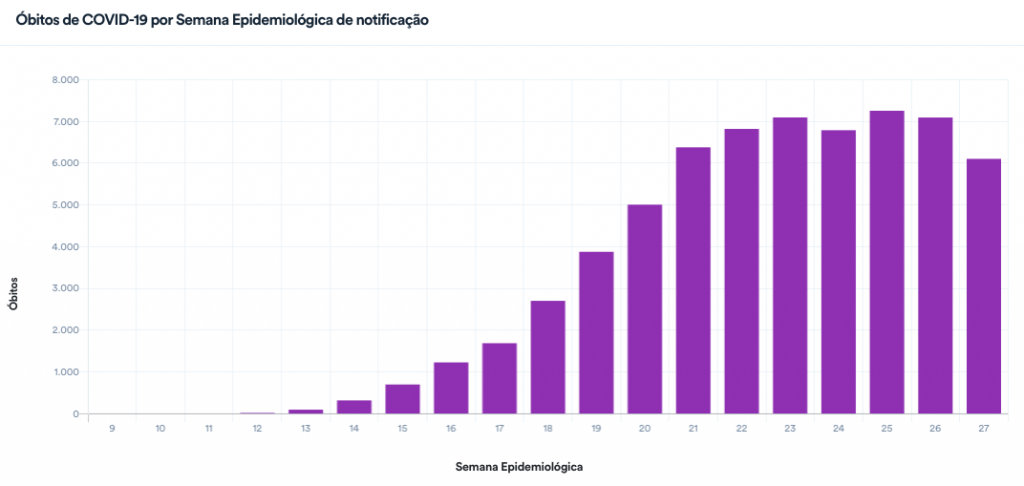O Brasil tem 46% mais mortos do que o segundo no ranking: México (679), e 54% mais que o terceiro colocado: EUA (583). Enquanto o México segue em escala ascendente, os EUA mantém semanas de queda consistente nos óbitos, embora os casos começam a crescer novamente.