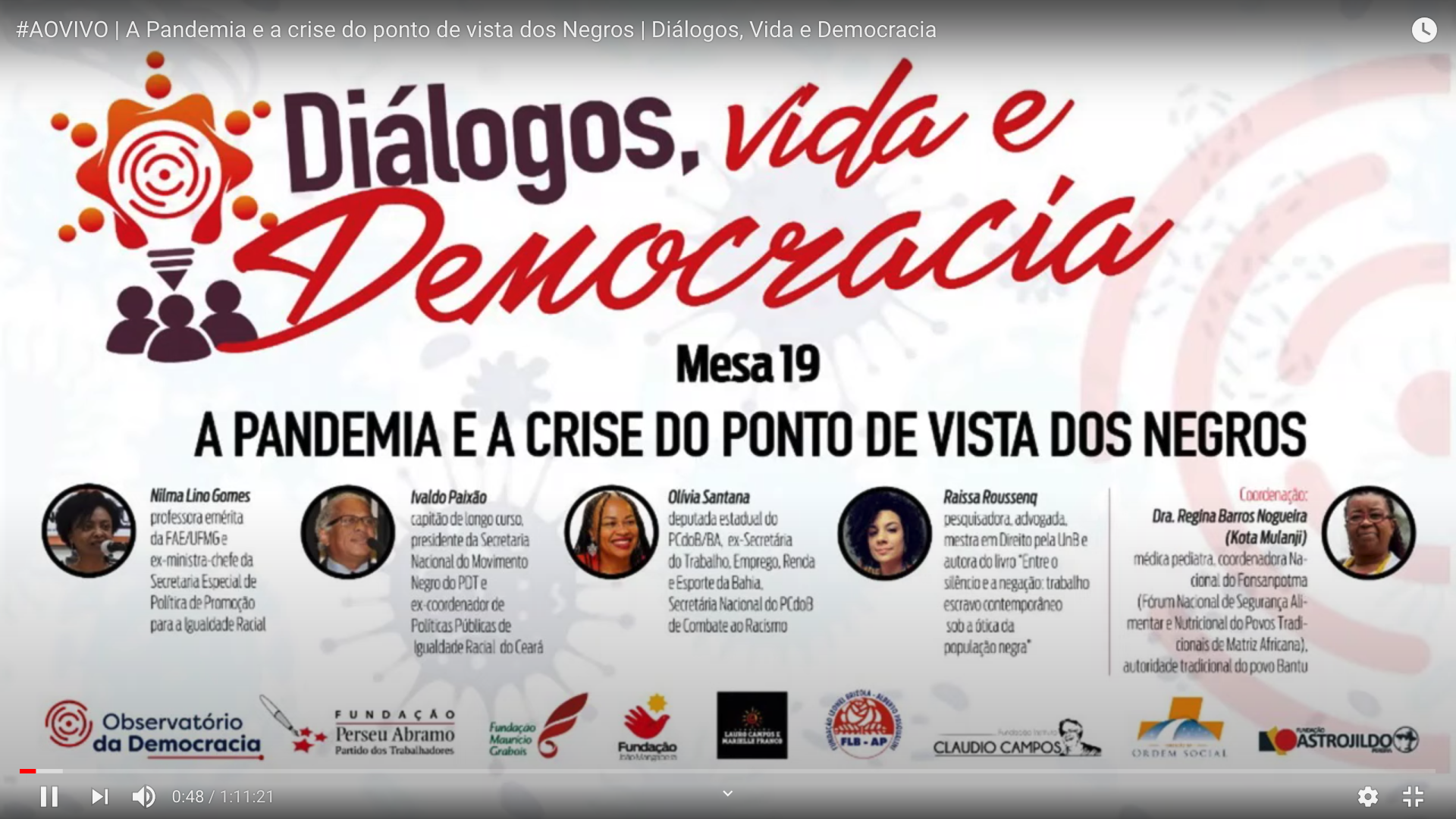“A pandemia e a crise do ponto de vista dos negros” foi o tema da mesa do ciclo Diálogos, Vida e Democracia, promovido pelo Observatório da Democracia, que representa oito fundações partidárias.