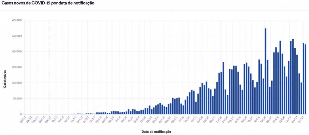 Nas últimas 24h, foram adicionadas 1.223 mortes aos registros oficiais. Há ainda 4.105 óbitos em investigação. O painel do órgão também trouxe 44.571 novos casos diagnosticados de ontem (7) para hoje. Estão em acompanhamento no país 624.695 pacientes infectados pelo novo coronavírus.
