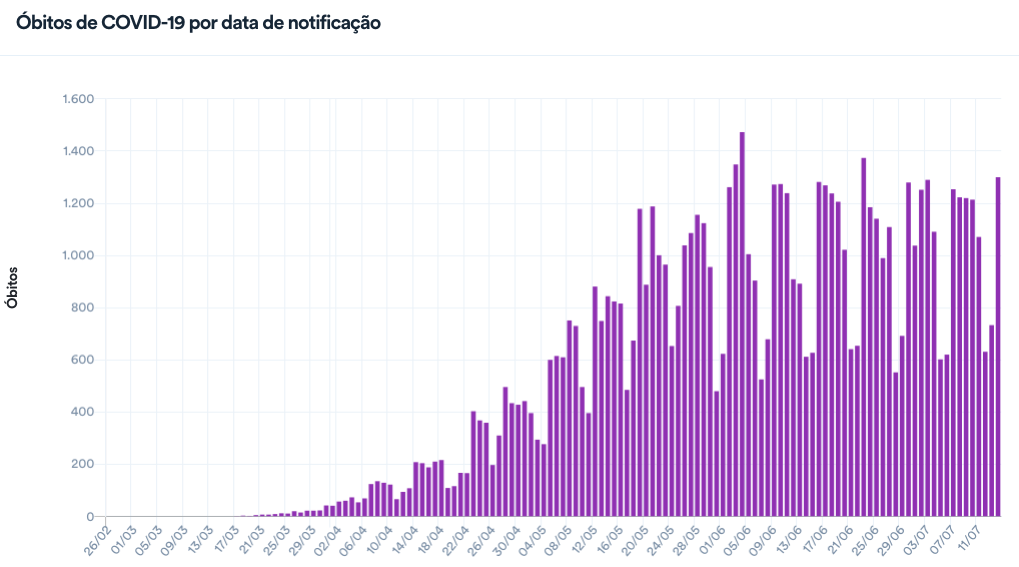 O Ministério da Saúde informou hoje que contabilizou nas últimas 24 horas 1.300 novas mortes por coronavírus em todo o país. Foi o dia com maior registro de óbitos em três semanas desde as 1.374 reportadas no dia 23 de junho.