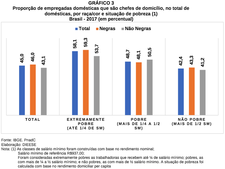 O estudo do Diesse destaca que o trabalho doméstico é desempenhado principalmente por mulheres negras. Ressalta também que a média de idade das mulheres é alta, o que as coloca em situação de maior vulnerabilidade ante a pandemia. Além disso, boa parte delas é responsável pela renda familiar – 45% delas são chefes de domicílio, e sua renda é muito importante para a família.