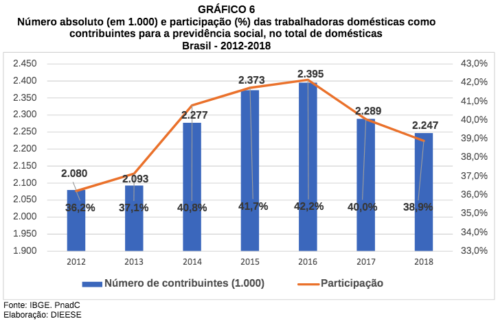 Segundo a economista e técnica do Dieese Cristina Vieceli, o Brasil tem 6,23 milhões de trabalhadoras domésticas, das quais 70% não têm carteira assinada, o que revela o alto índice de informalidade no setor. Apenas 38% dessas trabalhadoras contribuem para a Previdência Social, o que, em situação de desemprego, as deixa desassistidas pelo sistema de seguridade e impedidas de receber auxílio-doença ou auxílio-desemprego.