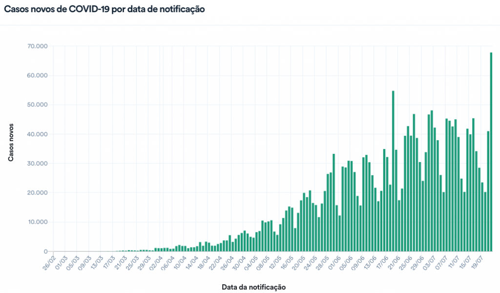 O Ministério da Saúde anunciou hoje (22) que passou a contar, nas últimas 24 horas, 67.860 novos diagnósticos confirmados de covid-19. É um novo recorde diário de notificações, superando a marca de 54.771 pacientes registrados no último dia 19 de junho.