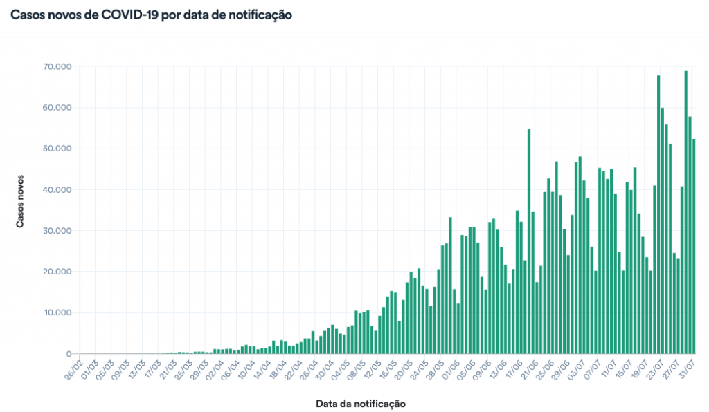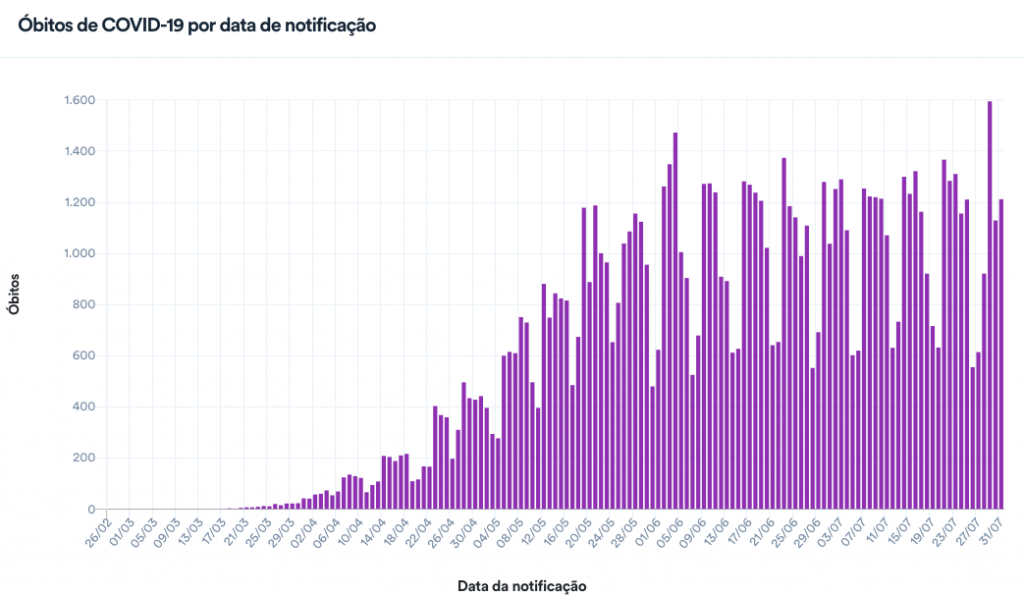 País registra maior número de casos em mais um dia de recorde no mundo. Com 32.912 mortes, julho teve mais de um terço dos 92 mil óbitos por covid.