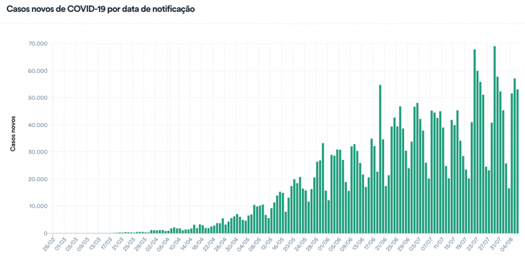 O número acumulado de casos da doença chegou a 2.912.212. Nas últimas 24 horas, o painel do órgão recebeu a notificação de 53.139 novos casos das autoridades locais de saúde. Até ontem, a pasta havia contabilizado 2.859.073 pessoas infectadas desde o início da pandemia.