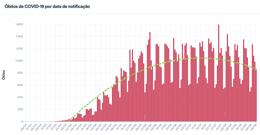 A curva epidemiológica de Covid-19 nacional começa a confirmar uma queda, depois de um longo pico de três meses. Tanto a curva de contágios, como a de óbitos começam a sair do platô para uma descendente, sendo que a queda no número de casos é o melhor sinal de que a curva de mortes vai se reduzir. O Brasil é o único país do mundo em que a curva permaneceu por tanto tempo no pico.