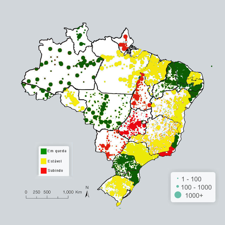 - Em queda: PR, SC, ES, DF, MT, AC, AM, RR, AL, CE, PE, PI e SE.