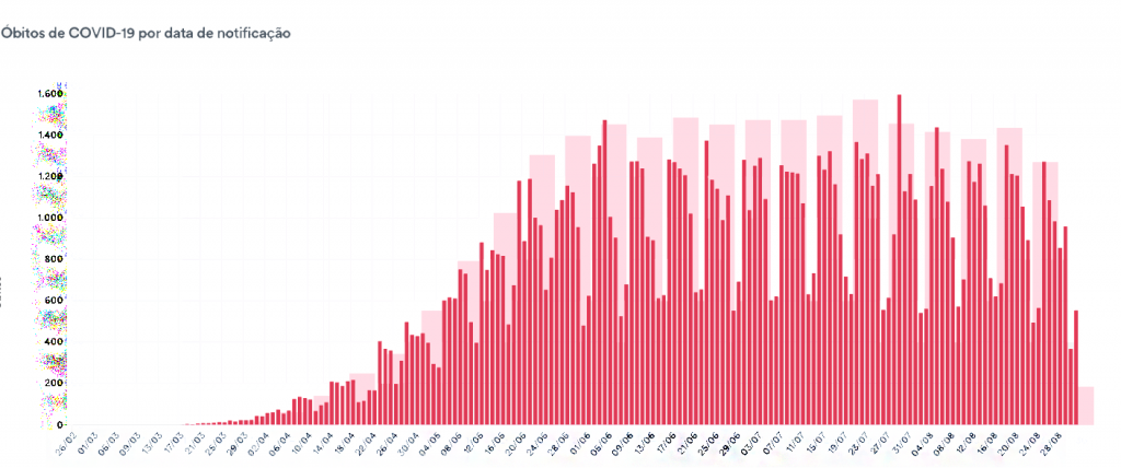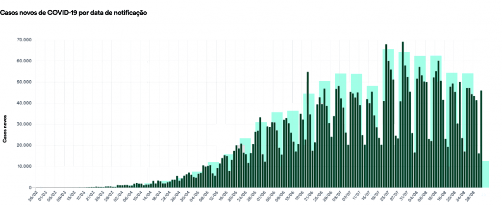 Os casos são menores aos domingos e segundas-feiras pelas limitações de alimentação pelas equipes das secretarias de saúde. Já às terças-feiras, o número usualmente tem sido maior pelo envio dos dados acumulados do fim de semana.