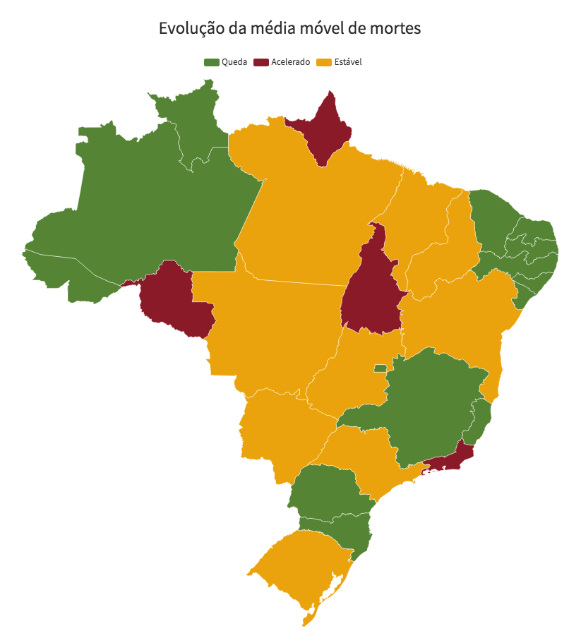 Treze estados e o Distrito Federal apresentaram desaceleração na média móvel de mortes por covid-19 nesta segunda-feira (31). De acordo com dados do consórcio de imprensa, outros quatro, porém, tiveram aumento na média móvel.
