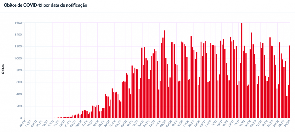 Os casos são menores aos domingos e segundas-feiras pelas limitações de alimentação pelas equipes das secretarias de saúde. Já às terças-feiras, o número geralmente tem sido maior pelo envio dos dados acumulados do fim de semana.