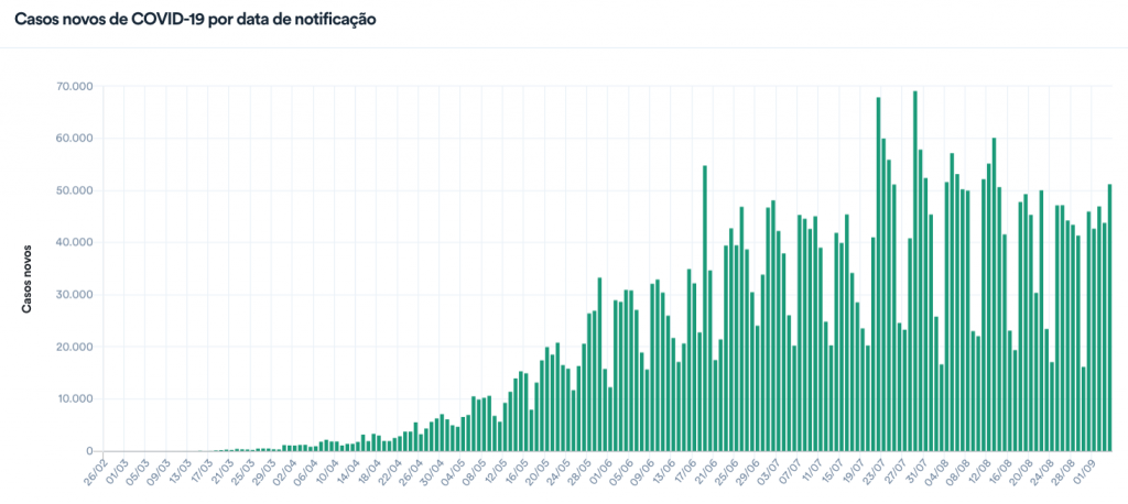 De acordo com o balanço da pasta, desde o início da pandemia, 4.091.801 pessoas foram infectadas com o coronavírus. Entre ontem e hoje, as secretarias de saúde acrescentaram às estatísticas 50.163 novas pessoas diagnosticadas com a doença. Ontem o sistema de dados sobre a pandemia trazia 4.041.638 casos.