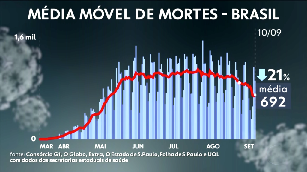 O balanço indicou 874 mortes em 24 horas. Com isso, a média móvel de novas mortes no Brasil nos últimos 7 dias foi de 692 óbitos, uma variação de -21% em relação aos dados registrados em 14 dias. O cálculo é feito pelo consórcio da imprensa.