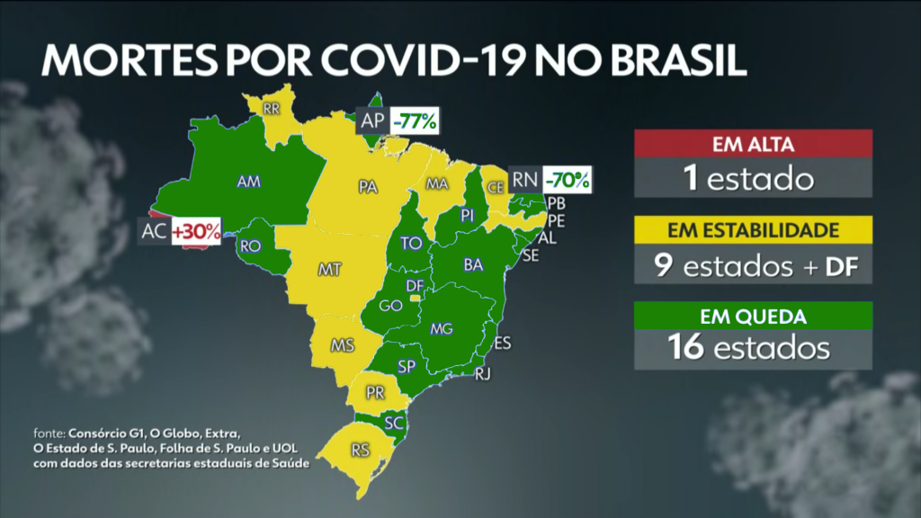 - Em estabilidade, ou seja, o número de mortes não caiu nem subiu significativamente (10 estados): PR, RS, DF, MS, MT, PA, RR, CE, MA e PE.