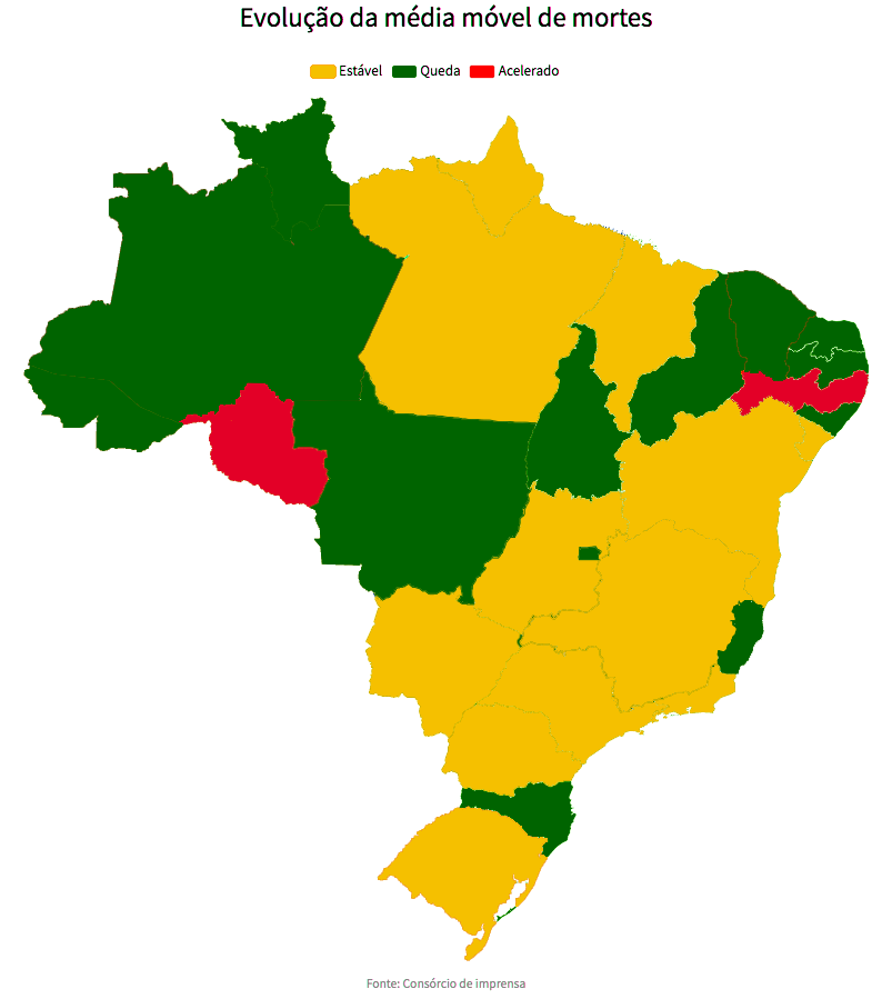 - Em estabilidade, ou seja, o número de mortes não caiu nem subiu significativamente (11): PR, RS, MG, RJ, SP, GO, MS, AP, PA, BA e MA.