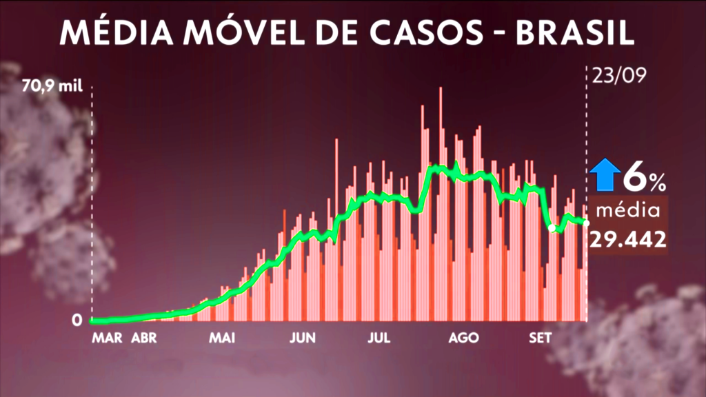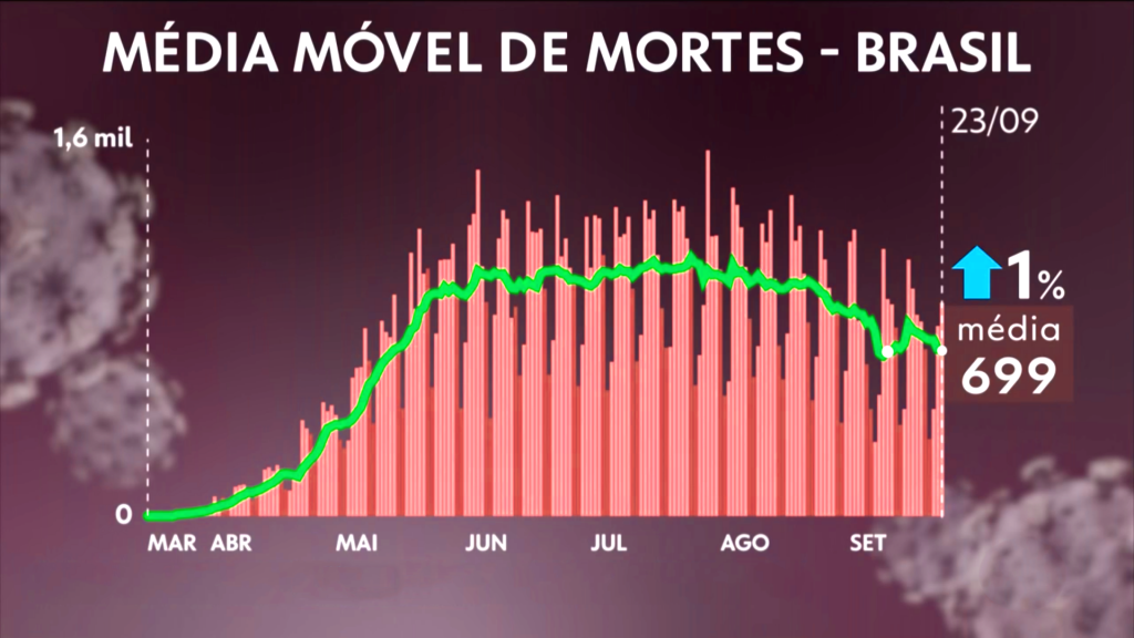 Segundo levantamento do consórcio da imprensa, a média móvel de mortes é de 699, com aumento de 1%, que representa estabilidade da curva.