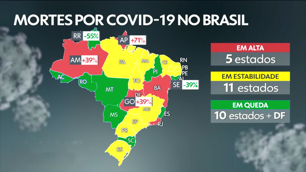 As Unidades da Federação com menos óbitos são Roraima (635), Acre (653), Amapá (698), Tocantins (901) e Mato Grosso do Sul (1.217).