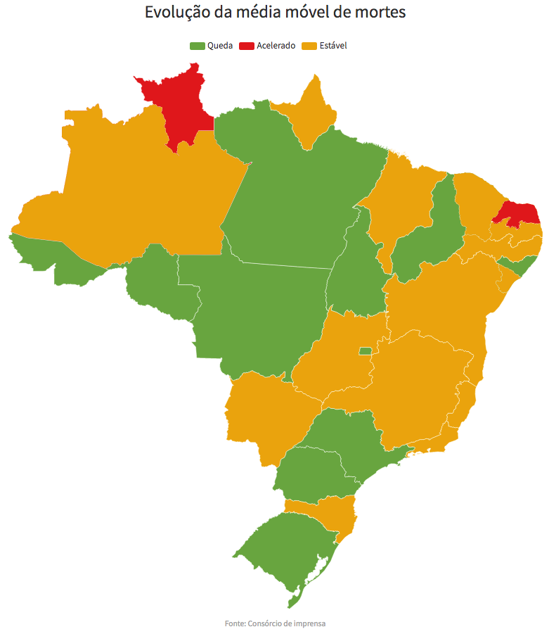 - Em estabilidade, ou seja, o número de mortes não caiu nem subiu significativamente (14 estados): SC, ES, MG, RJ, GO, MS, AM, AP, BA, CE, MA, PB, PE e SE