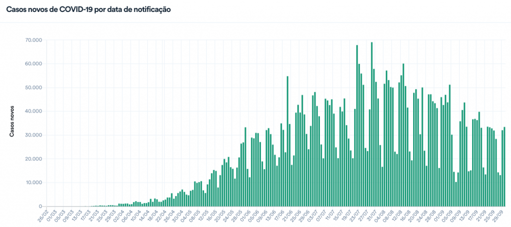 A quantidade de casos confirmados pelas secretarias de saúde dos estados entre ontem e hoje chegou a 33.269; ao todo, são 4.813.586 diagnósticos no país. A média móvel de novos casos foi de 26.544 por dia, uma variação que aponta queda, com -15% em relação aos casos registrados em 14 dias.