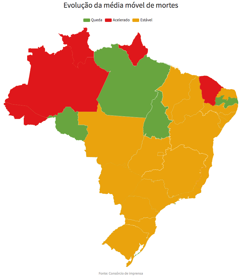 - Em estabilidade, ou seja, o número de mortes não caiu nem subiu significativamente (17 estados + o DF): PR, RS, SC, ES, MG, RJ, SP, DF, GO, MS, MT, AL, BA, MA, PE, PI, RN e SE