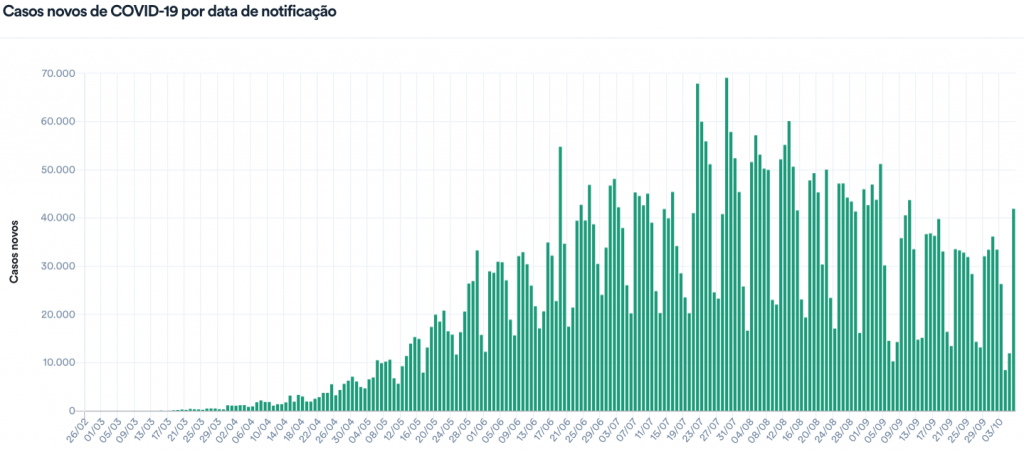 Os casos acumulados de Covid-19 atingiram 4.969.141. Até ontem, o painel do Ministério da Saúde marcava 4.927.235 casos desde o início da pandemia.