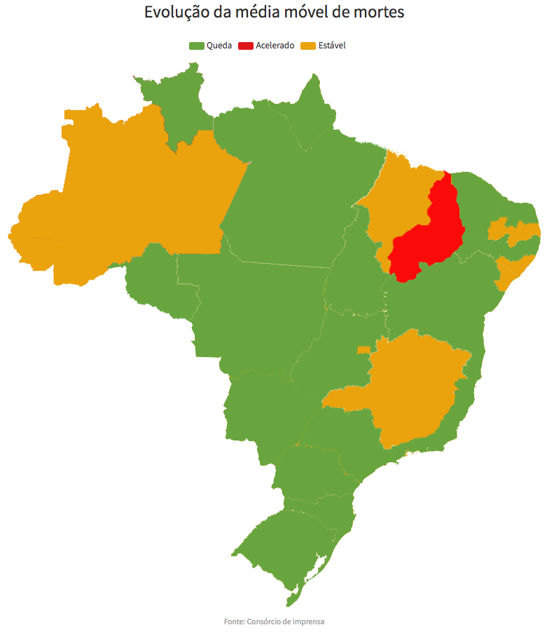 - Em estabilidade, ou seja, o número de mortes não caiu nem subiu significativamente (7 estados + o DF): MG, DF, AC, AM, AL, MA, PB e SE