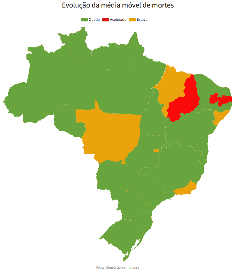- Em estabilidade, ou seja, o número de mortes não caiu nem subiu significativamente (5 estados + o DF): RJ, DF, MT, AL, MA e SE