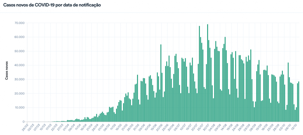 Já o número de diagnósticos positivos de Covid-19 teve o acréscimo de 28.523 em 24 horas. A média móvel de novos casos foi de 20.208 por dia, uma variação de -25% em relação aos casos registrados em 14 dias. Ou seja, também encontra-se na faixa que aponta queda.
