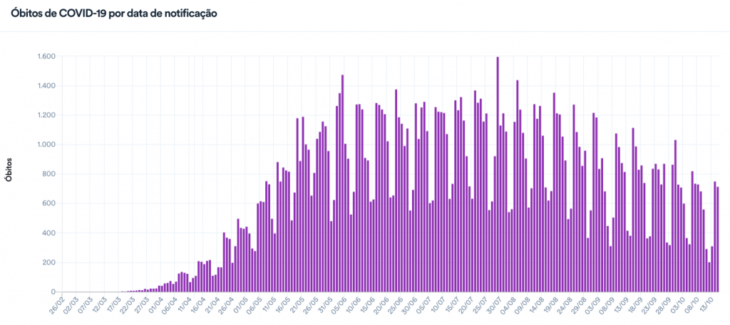O Brasil registrou 713 mortes em 24 horas, elevando o total de óbitos para 152.460. Outras 2.360 mortes estão em investigação. Com isso, a média móvel de mortes no Brasil nos últimos 7 dias foi de 497, uma variação de -26% em relação aos dados registrados em 14 dias.
