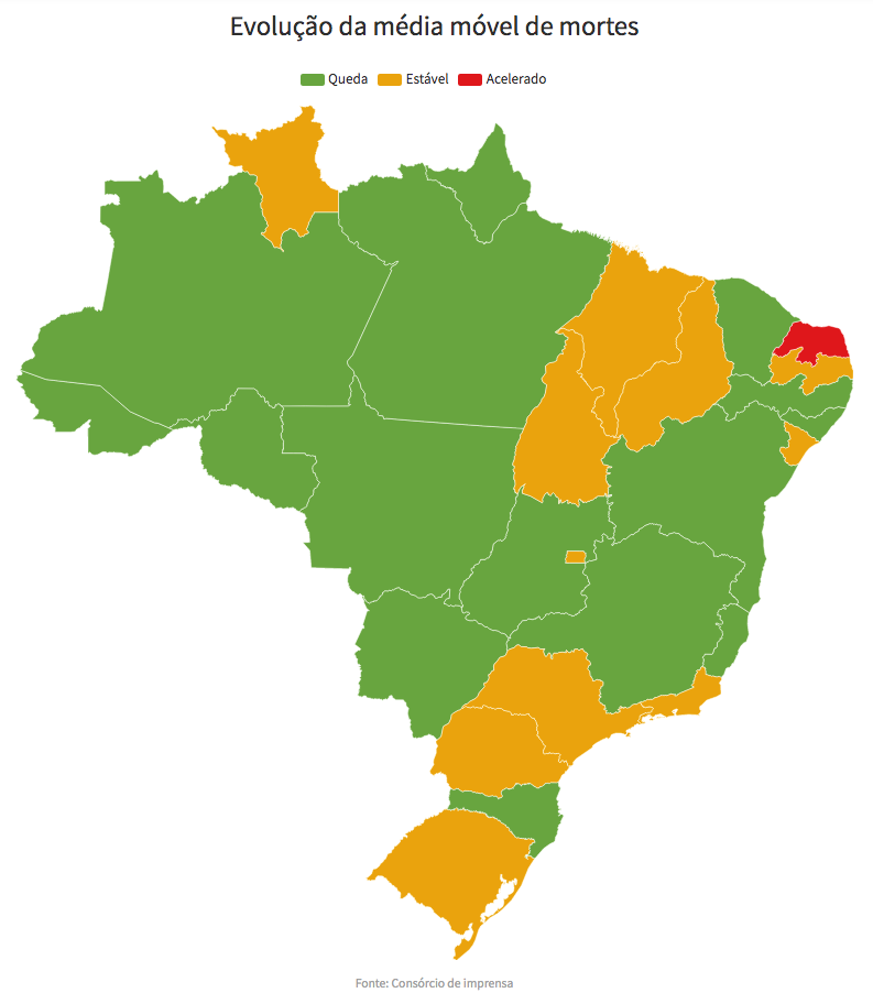 - Em estabilidade, ou seja, o número de mortes não caiu nem subiu significativamente (10 estados + o DF): PR, RS, RJ, SP, DF, RR, TO, MA, PB, PI e SE
