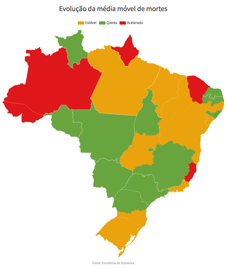 - Em estabilidade, ou seja, o número de mortes não caiu nem subiu significativamente (10 estados): RS, SC, RJ, GO, PA, BA, MA, PE, PI e SE