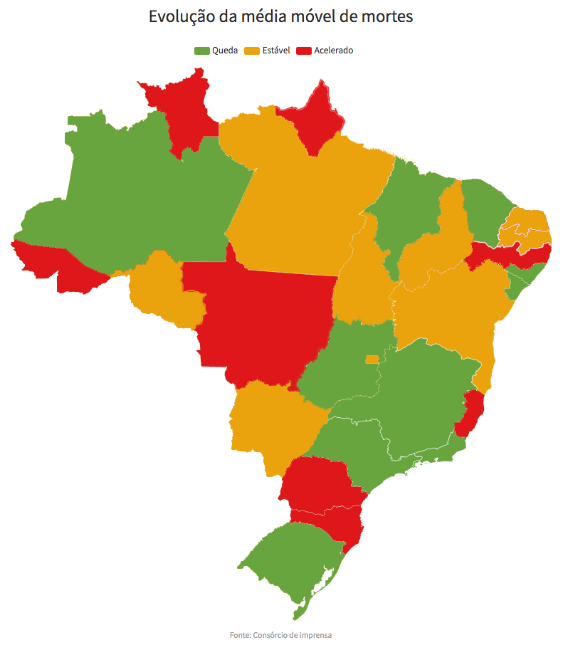Oito estados apresentam indicativo de alta de mortes: Paraná, Santa Catarina, Espírito Santo, Mato Grosso, Acre, Amapá, Roraima e Pernambuco.