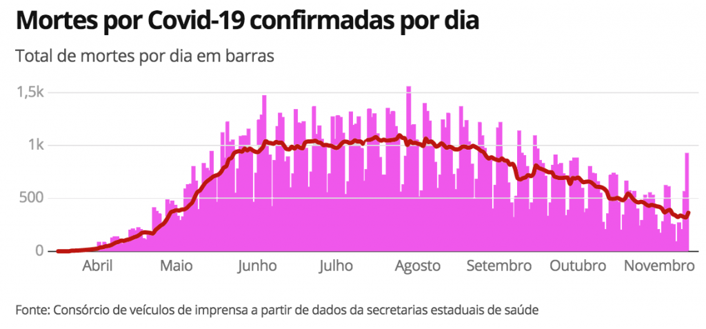 É o maior registro de mortes em 24 horas desde o dia 16 de setembro, porém, o número fora da curva deve ser reflexo de represamento causado após problemas de acesso ao sistema do Ministério da Saúde (e-SUS), que reúne os registros. Assim, alguns estados como São Paulo, Minas Gerais e Rio de Janeiro, que ficaram alguns dias sem divulgar seus boletins, podem ter números de óbitos e de casos que ficaram acumulados.