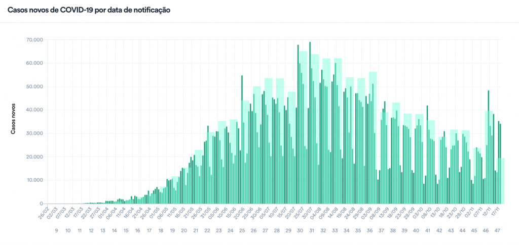 A média móvel nos últimos 7 dias foi de 28.342 novos diagnósticos por dia, uma variação de +68% em relação aos casos registrados em duas semanas. Também aponta tendência de alta em relação às duas últimas semanas.