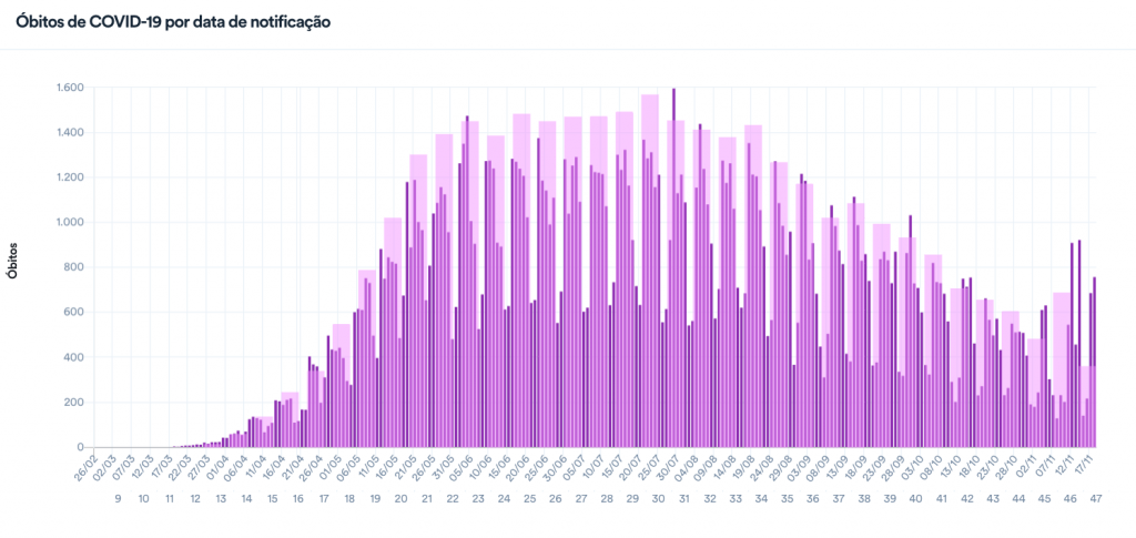 Com isso, a média móvel de mortes no Brasil nos últimos 7 dias foi de 584, a maior desde o dia 11 de outubro. A variação foi de +49% em comparação à média de 14 dias atrás, indicando tendência de alta nas mortes por Covid-19. Assim como na véspera, essa é novamente a maior alta registrada desde o mês de maio, segundo o levantamento do consórcio da imprensa.