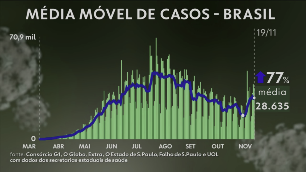Conforme cálculo do consórcio da imprensa, a média móvel nos últimos 7 dias foi de 28.635 novos diagnósticos por dia, uma variação de +77% em relação aos casos registrados em duas semanas. Também aponta forte tendência de alta em relação às duas últimas semanas.