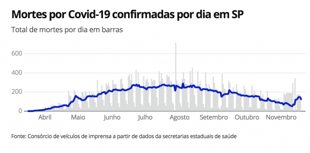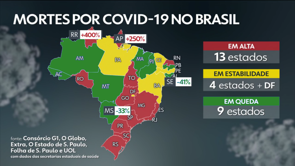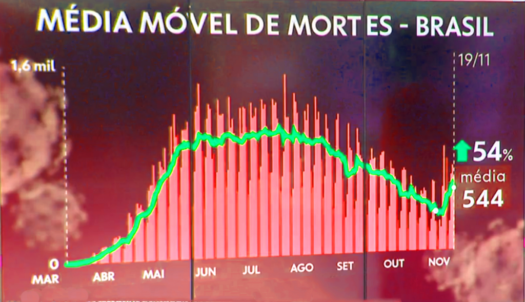 Com isso, a média móvel de mortes no Brasil nos últimos 7 dias foi de 544, de acordo com a imprensa. A variação foi de +54% em comparação à média de 14 dias atrás, indicando tendência de alta nas mortes por Covid-19.