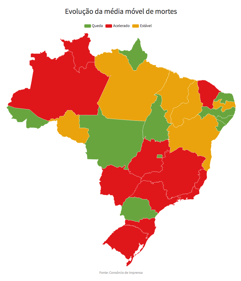 - Em estabilidade, ou seja, o número de mortes não caiu nem subiu significativamente (6 estados): PA, RO, BA, MA, PB e PI