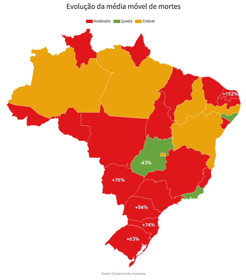 - Em estabilidade, ou seja, o número de mortes não caiu nem subiu significativamente (5 estados): ES, MG, PA, BA e MA