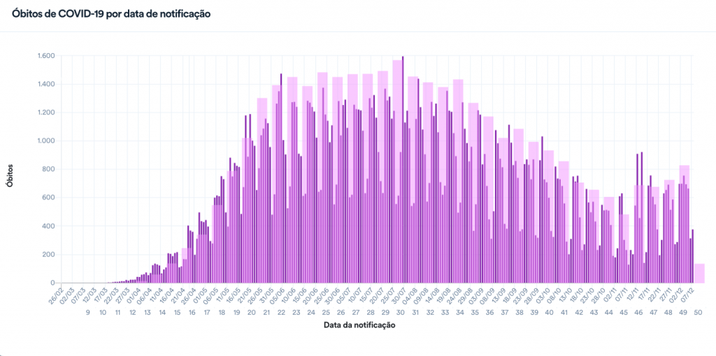 Com isso, a média móvel de mortes no Brasil nos últimos 7 dias foi de 603, a mais alta registrada desde 10 de outubro (604). Segundo o cálculo do consórcio da imprensa, a variação foi de +23% em comparação à média de 14 dias atrás, indicando tendência de alta nos óbitos pela doença.
