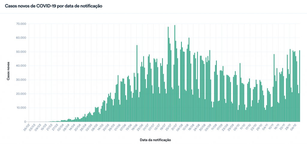 A média móvel nos últimos 7 dias foi de 41.056 novos diagnósticos por dia. Isso representa uma variação de +31% em relação aos casos registrados em duas semanas, o que indica tendência de alta também nos diagnósticos.