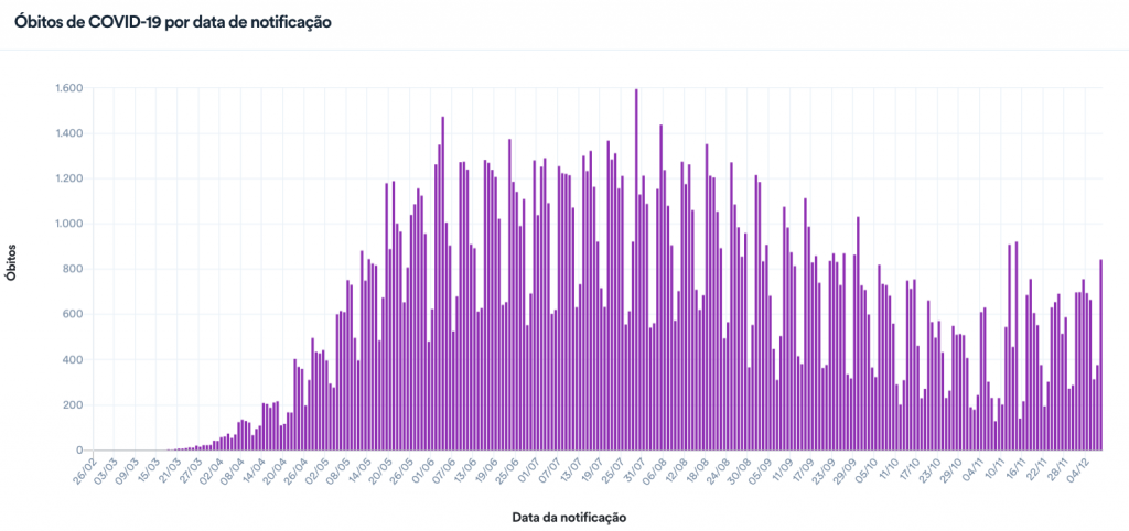 Segundo o cálculo do consórcio da imprensa, foram em média 617 óbitos nos últimos 7 dias, uma variação de 31% na comparação com 14 dias atrás. Ontem o país voltou a ter média de mortes acima de 600, um fenômeno que não ocorria desde 10 de outubro.