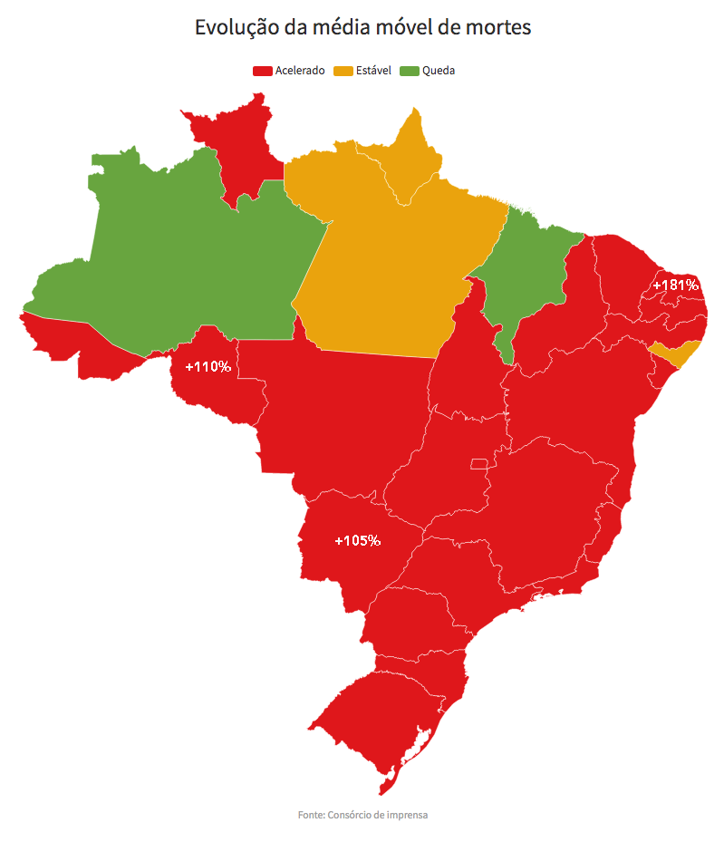 Os números do consórcio indicam que novamente o Brasil tem 21 estados mais o Distrito Federal com tendência de alta na média móvel de mortes. Ontem o país registrou a mesma quantidade de altas. É o maior número de estados em aceleração desde o início do cálculo pelo grupo de veículos de imprensa.