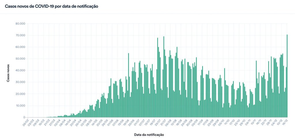 Boletim de hoje mostra mais de 70 mil novos casos e 936 mortes. Número recorde de infecções em um dia, não inclui dados de São Paulo e é maior que o pico de 29 de julho.