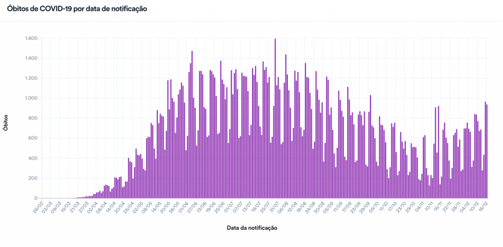 O número de mortes provocadas em um intervalo de 24 horas é o maior em três meses: houve 936 novos registros, com um total de 183.735 óbitos desde o começo da pandemia. O país não via um marco tão alto desde 15 de setembro, quando foram confirmadas 1.113 mortes.